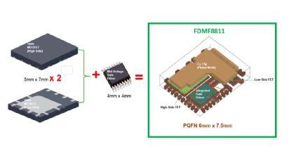 FDMF8811集成了一對(duì)100V的功率MOSFET、120 V驅(qū)動(dòng)器IC和一個(gè)自舉二極管到6.0 mm x 7.5 mm 的PQFN封裝。