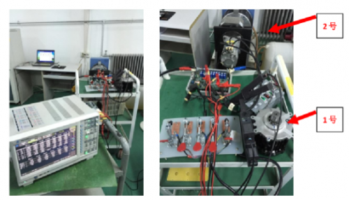 此次測試的對象為小型電機(jī)系統(tǒng),系統(tǒng)分為驅(qū)動器、電機(jī)平臺、測試,3個部分。驅(qū)動器輸出通過電纜連接到電機(jī)平臺,電機(jī)轉(zhuǎn)軸上安裝扭矩傳感器,傳感器所有連接線引到測試儀器,傳感器輸出信號接入功率分析儀電機(jī)測量單元扭矩BNC接口。傳感器輸出100kHz±50kHz脈沖對應(yīng)0±5Nm扭矩。