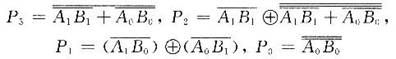 兩位乘法器能夠實現2位二進制數的乘法運算,設A1A0,B1B0為乘數和被乘數,P3P2P1P0為乘法運算得到的積,由卡諾圖(見圖2)得到兩位乘法器的輸出邏輯函數表達式分別為: