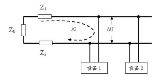 這里設備1是產生諧波電流的設備,它工作時向電網注入諧波電流。由于電網有一定的阻抗,電網的阻抗包括,變壓器的阻抗Z0,線路的阻抗Z1和Z2,總的阻抗就Z=(Z0+Z1+Z2)。當設備1向電網注入諧波電流時(記為In),則在電網的阻抗Z上產生了諧波電壓(記為Un),于是設備2的電源輸入端就出現了諧波電壓Un。如果諧波電壓超過了設備2能夠承受的程度,設備2就會受到這個諧波電壓的干擾。一般電子設備允許的諧波畸變率為UTHD<5%。